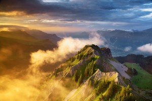 Lumière du soleil couchant illuminant des nuages de brouillards virvoltant sur l’arrête de Pré Fleuri, vue depuis la Pointe de Bellevue (2042m), En arrière plan se distingue la vallée du Rhône. / Sunset light illuminating clouds of mist stroking the Pré Fleuri ridge, as seen from Pointe de Bellevue (2042m). In the background can be seen the Rhône valley.