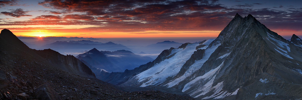 Lever de soleil sur le Portjenhorn (3567m) et les Alpes italiennes vu depuis le col du Zwischbergen (3268m d’altitude) / Sunrise over the Portjenhorn (3567m) and the Italian Alps seen from the Zwischbergenpass (3268m of altitude)