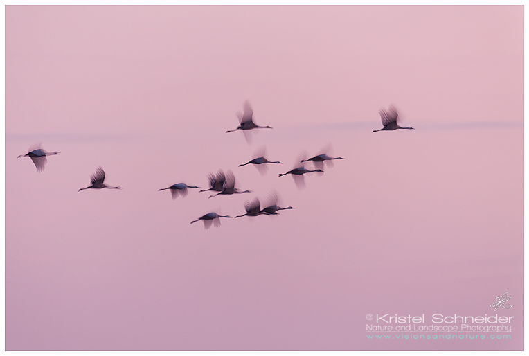 Abstract image of Cranes flying in last light of the sun, Lac en Der, France