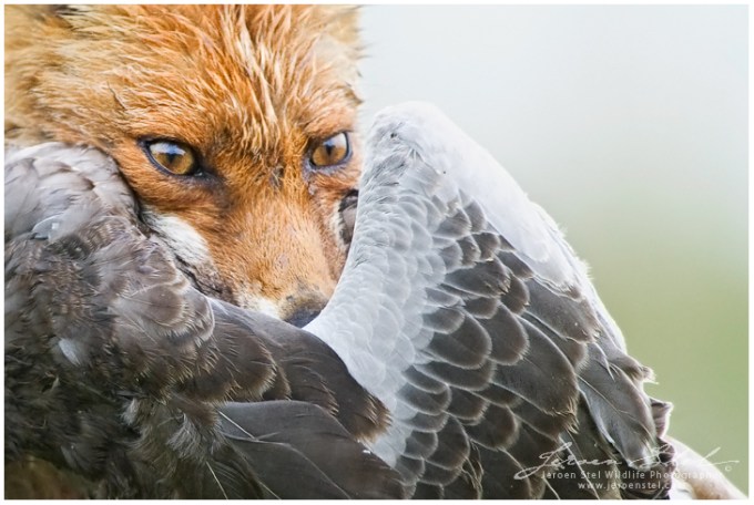One of these experiences was the time I was laying in a clover field hiding behind my lens and waiting for a fox which had just been hunting Grey-lag Geese and had caught one. She was on her way back to her den and walked only 2 meters past me. This shot was taken at my minimum focal length at a distance of about 4 or 5 meters, as when she was walking toward me.