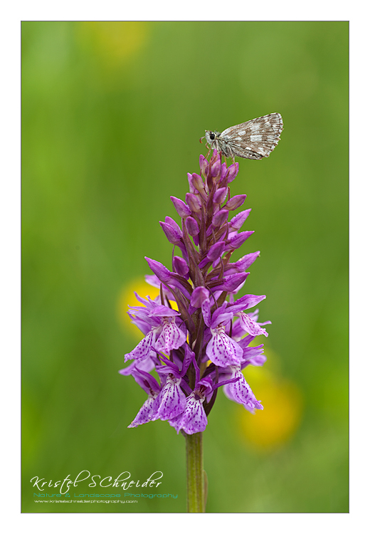 I always look what kind of other flowers or grass grow behind the Orchid so that I can capture a nice colour contrast, like I did with the Common Spotted Orchid with the moth on top. I used a wide aperture to keep the main subject in focus and create a nice soft background with yellow defocussed flowers. Always use a tripod to prevent camera shake and a sharper end result.